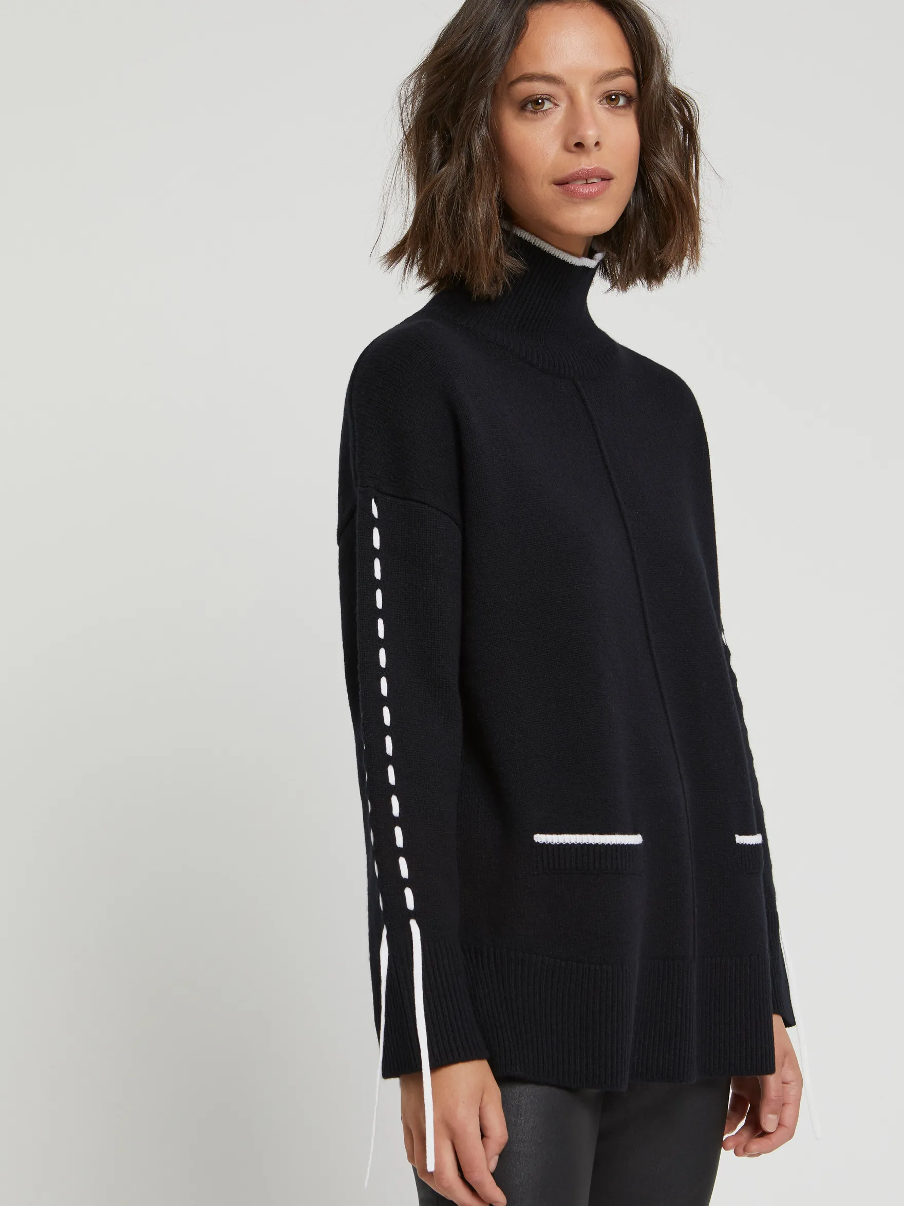 Wool And Cashmere Turtleneck Sweater Featuring Ribbed Finishes, Long Sleeves, Two Front Pockets And Lace Detailing Along The Sleeves To The Wrists.