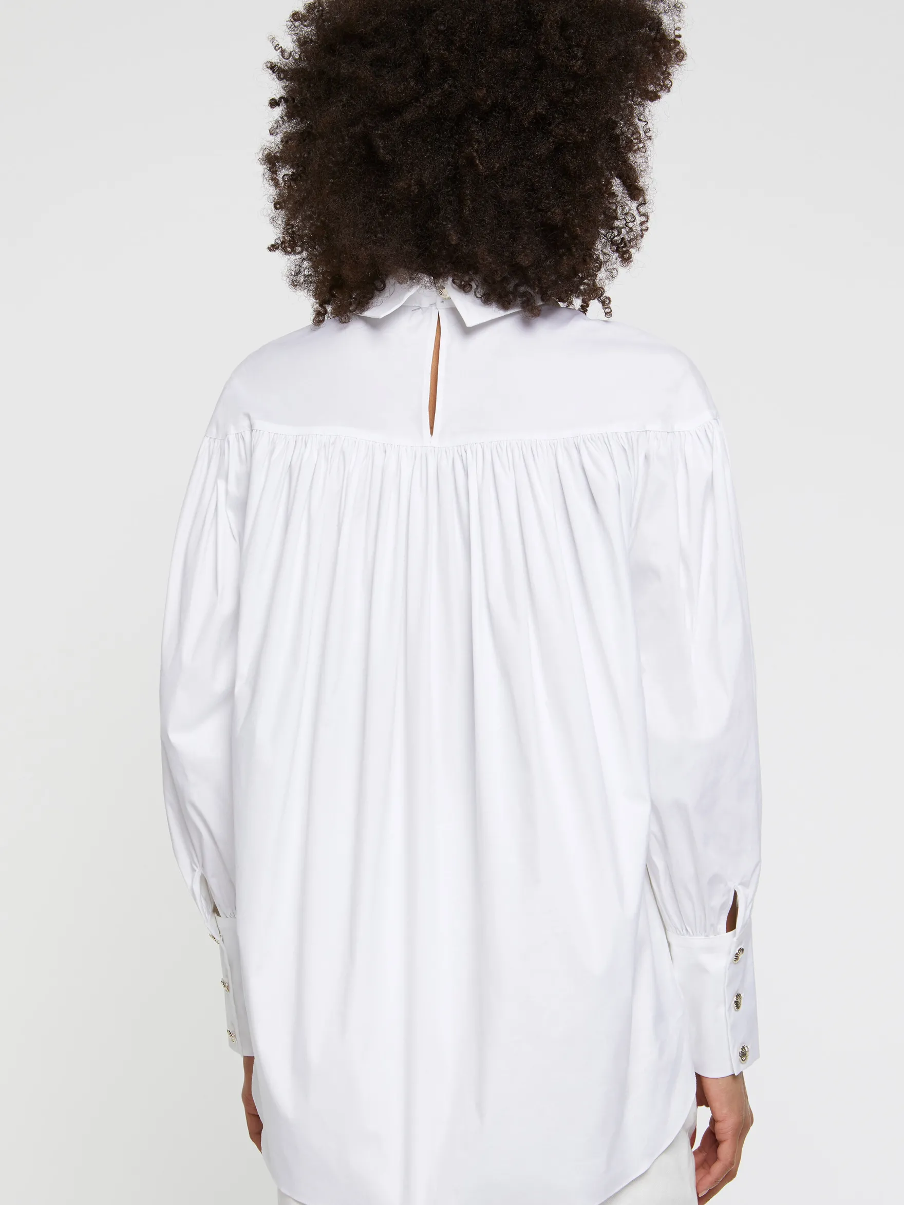This Stretch Cotton-Poplin Blouse Features An Understated Cut And A Single Decorative Button At The Shirt Collar. Above The Chest And Around The Shoulders, A Defined Seam Structures The Design. The Fall Of The Delicate Pleats Creates Beautiful Volume. Generous Puffed Sleeves Complete The Look.
